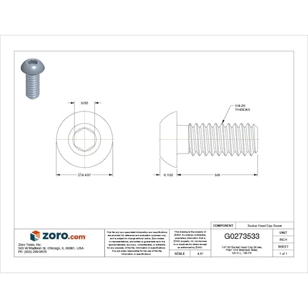 Socket Head Cap Screw, Head Type Button, System of Measurement Inch, Drive Type Socket, Drive Size 5/32 in, Material Stainless Steel, Material Grade/Class 18-8, Finish Plain, Thread Size 1/4 In.-20, Minimum Thread Length 5/8 in, Fastener Length 5/8 in, Head Height 0.132 in, Head Diameter 0.437 in, Pack Size Small Pack, Thread Style Fully Threaded, Special Features Not Applicable, Countersink Angle Not Applicable, Dimensional Standards ASME B18.3, Flange Diameter Not Applicable