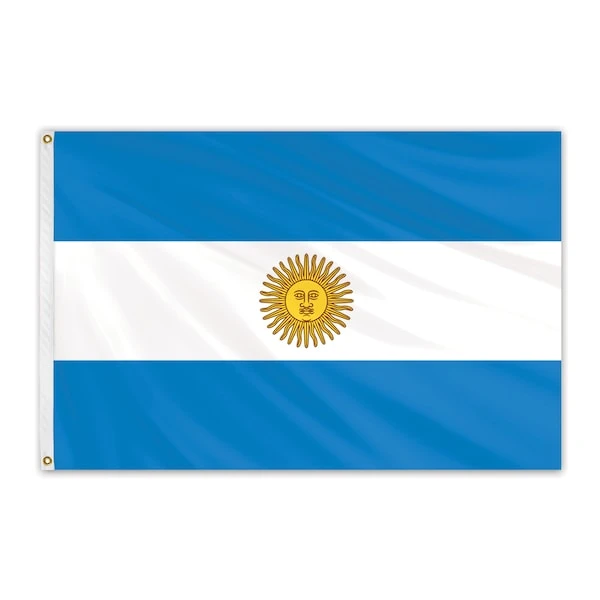 Unsurpassed in beauty and craftsmanship, these nylon outdoor flags are manufactured to precise specifications. Expertly crafted using 100% heavyweight, 200-denier nylon bunting, and treated to resist sun and chemical deterioration. Extremely durable and fast drying, nylon flags are the most popular choice for outdoor flags. All nylon flags are finished with a strong, durable snow-white header and brass grommets. The flag of Argentina features a design called a “triband” meaning three equally wide horizontal rows. This Argentinean flag features the Sun of May in the center, and is called the “Bandera Oficial de Ceremonia” (Official Ceremonial Flag).