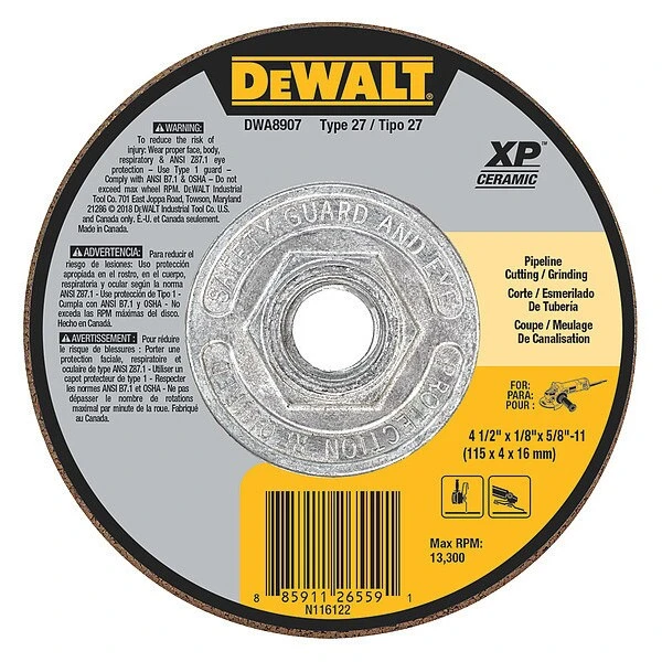 Cut-Off & Grinding Wheel, Abrasive Material Ceramic, Connector Size 5/8 In.-11, Connector Type Threaded Hole, Grit 24, Overall Diameter 4 1/2 in, Overall Thickness 0.125 in, Primary Material Applicationn Nickel Alloy, Stainless Steel, Steel, Compatible Tool Type Angle Grinder, Series SG24N, Wheel Type Type 27, Maximum Operating Speed 13,300 RPM, Grade Coarse