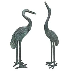 These bronze crane statues, reminiscent of the European tradition of splendid, grand-scale garden art, artistically captures the form and grace of elegant herons. Our bronze crane statues, finished with a hand-applied emerald verde bronze patina, are cast one piece at a time in the traditional lost wax method, which highlights their graceful legs and exquisite, elongated necks. Sure to be a focal point, these Design Toscano heirloom-quality bronze garden statues convey that you take the exterior of your home as seriously as the interior. Piped to optionally cascade flowing water from the crane’s beaks into your pond, pool or fountain. Simply add two of the optional 290 GPH pond pump kits to create beautiful water music in your garden. Accommodates two Toscano Pump Kit DR-290, sold separately. Color patina is applied by hand one piece at a time, tone may vary slightly. Straight Neck: 7″Wx8″Dx31″H. 6 lbs. Curved Neck: 7″Wx121⁄2″Dx25″H. 6 lbs.