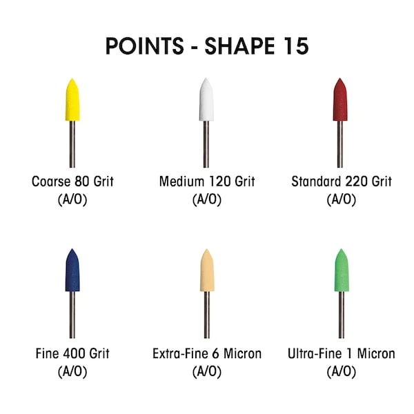 PRECISION – Sunburst Points are the “absolute best” for finishing & polishing hard-to-access areas without removing detail or causing flat spots. LONG-LASTING – Uniformly blended abrasive-filled points guarantee extended wear life and a consistent, uniform finish. Work faster and lasts longer than conventional point rubber polishers. COOL RUNNING – Generates minimal heat reducing potential damage or distortion to the work surface. USE-CASE – Precision points work on all precious, semi-precious and non-precious metals, acrylics, porcelains, and Thermoplastics. MEDIUM 120 GRIT – Texturing and light cleaning.