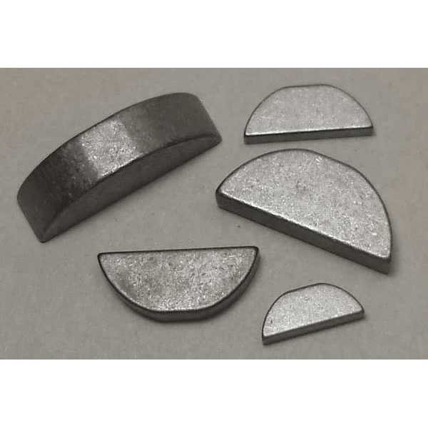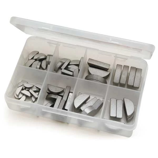 Woodruff Key Assortment, System of Measurement Inch, Material Steel, Material Grade/Class Ungraded, Finish Plain, Thickness Tolerance +0.001/-0.000 in, Number of Pieces 72, Number of Sizes 6, Manufacturer Location Made in USA*, Includes (10) #A (1/4×7/8 in), (12) #6 (5/32×5/8 in), (12) #9 (3/16×3/4 in), (12) #5 (1/8×5/8 in), (18) #3 (1/8×1/2 in), (8) #15 (1/4×1 in), Plastic Compartment Box with Lid Chart, Product Type Woodruff Key Assortment, Key Shape Woodruff, Rockwell Hardness B90