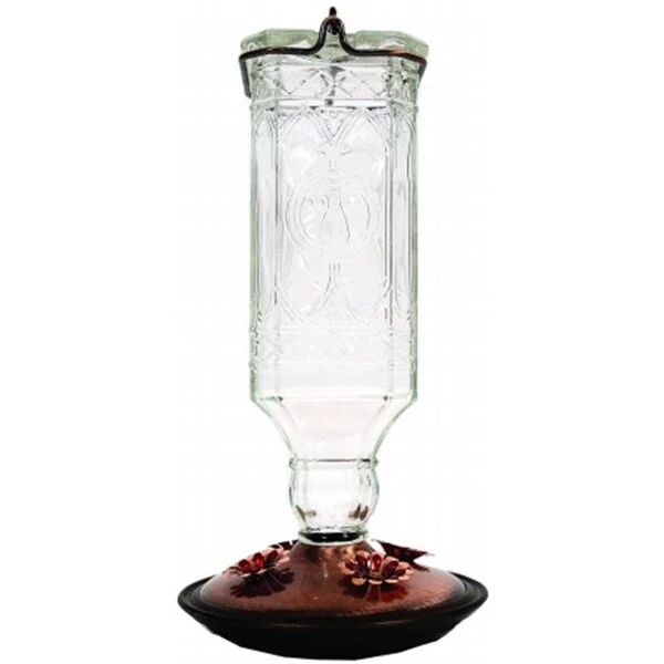 Decorative glass nectar reservoir with a unique square shape.Simple embossed glass and brushed copper base make this feeder an attractive and functional additional to yards.Hummingbirds will love feeding from the four decorative flower feeding ports.Base easily comes apart and reassembles for easy cleaning.L x W x H: 5.75 x 5.75 x 10.9