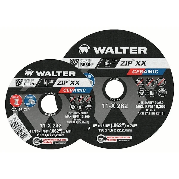 Achieve the ultimate gain in productivity and comfort with the new ZIP XX cut-off wheel. Made with a unique ceramic grain and WALTER’s new SMART RESIN technology, it provides the most cuts without compromising on speed & safety. Not only does it cut up to 10% faster than aluminum oxide wheels, it lasts at least 30% longer than competitive ceramic wheels. Use ZIP XX to increase productivity and reduce your overall cost.